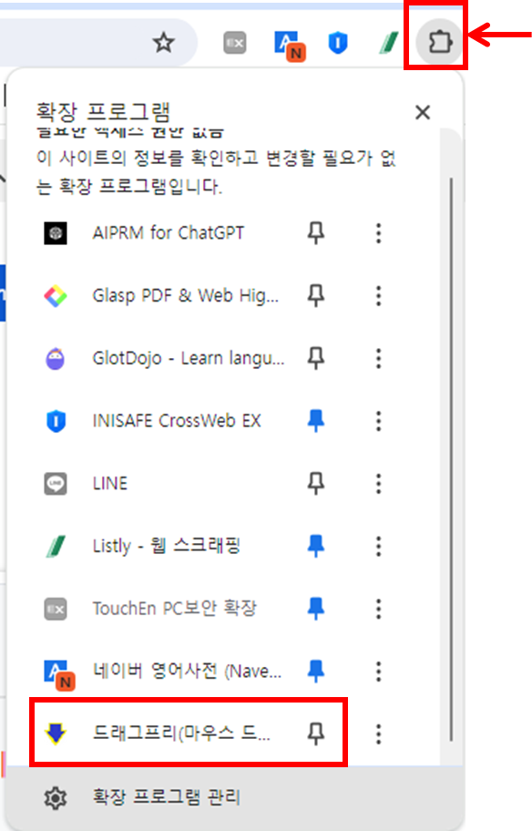 5. 크롬에서 화살표 버튼을 클릭하면 목록에 드래그프리가 보입니다. 그럼 설치가 잘 되었습니다.